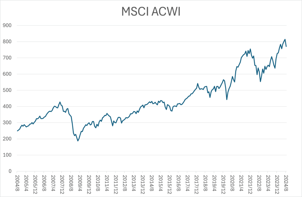 次に、世界の株式市場の時価総額を見てみます。これを指数化したものとしてMSCI ACWIとFTSE All-World Indexがありますが、どちらも同じ動きをしていますのでここでは前者のデータをinvesting.comから月次でとりました(2004年8月末から2024年8月6日終値)。