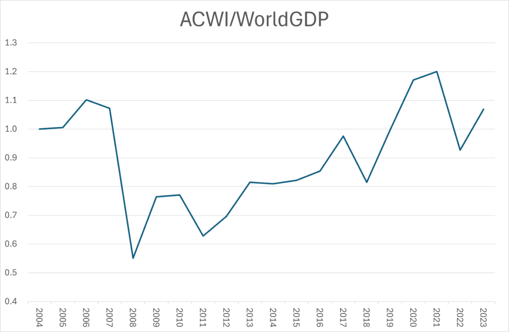 investing.comからとれるACWIのデータは2004年からです。8月1日投稿と同様、データを得られるスタート時点を100として、ACWI、世界名目GDPを指数換算し、ACWI÷世界名目GDPを計算してみました。