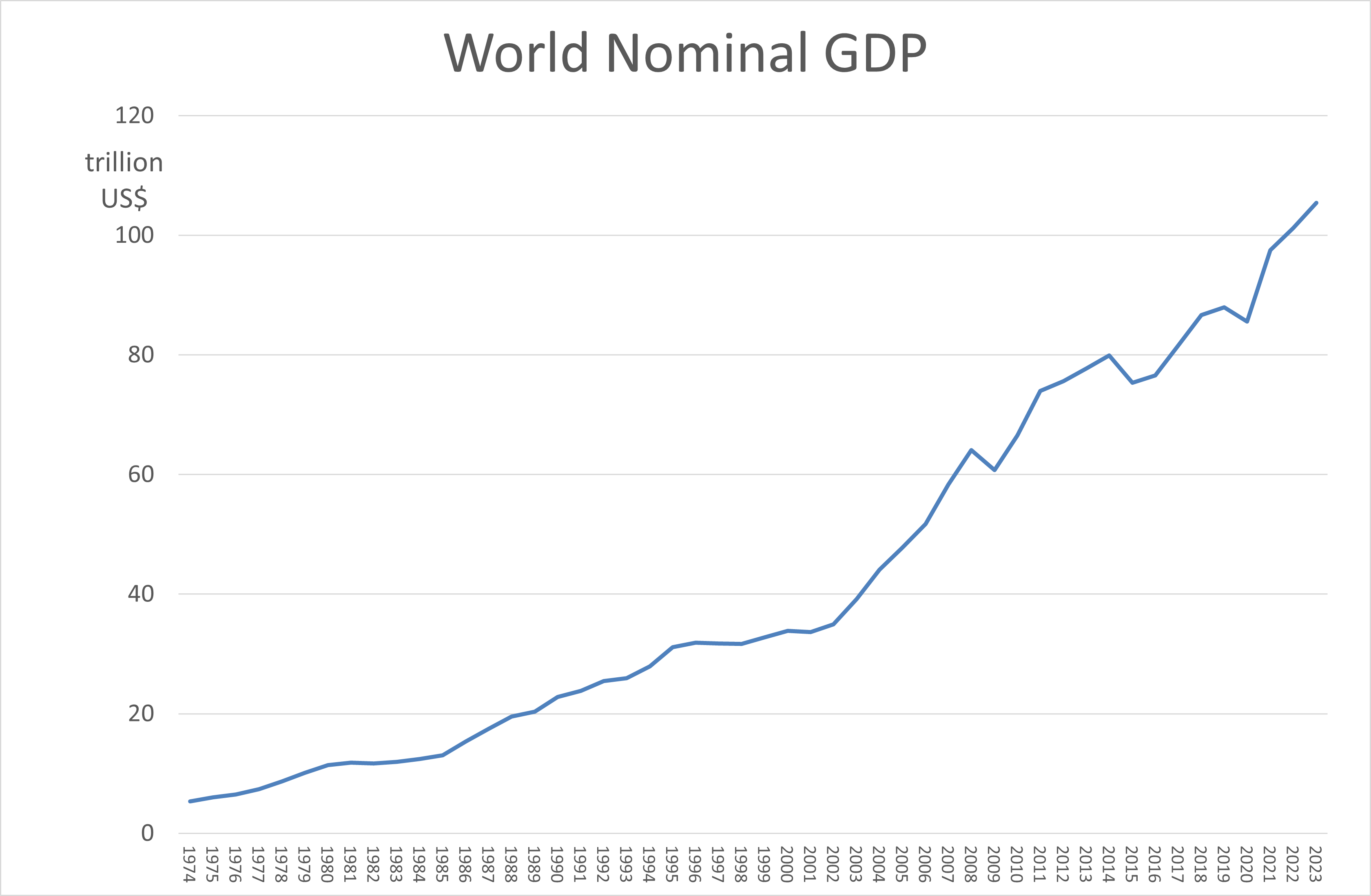 世界銀行が世界各国と全体のGDPを1974年分から公表しています。現時点では2023年までしか入手できませんが、長期でみれば度々若干の調整を経ながら成長を続けています。