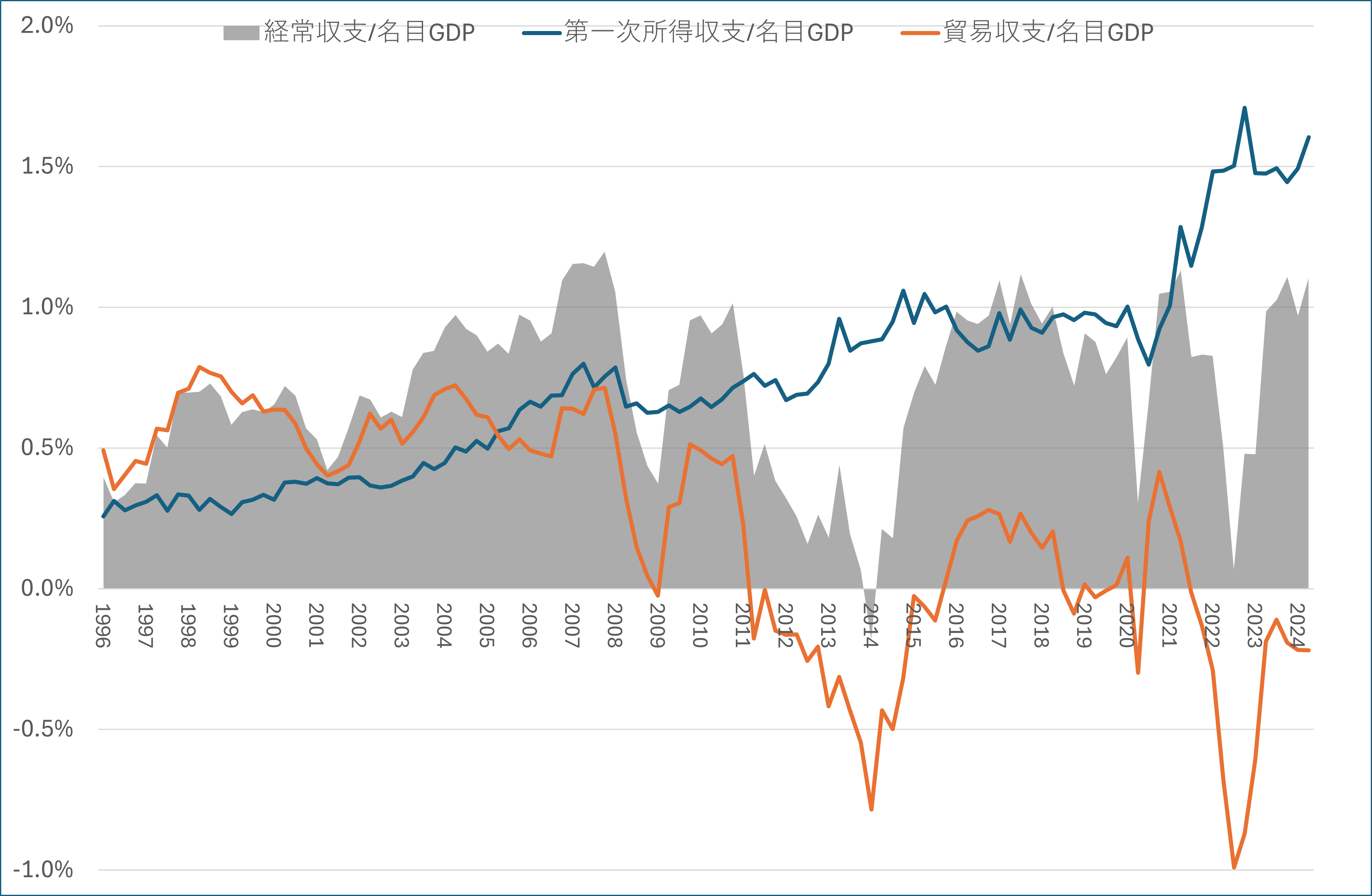 海外からの利子・配当収入は、内閣府が作成するGDP表では直接確認できませんが、国際収支表の「第一次所得収支(海外からの利子・配当収支)」で確認できます。ここでは1996年から数値を得られる季節調整値を使用し、名目GDP季節調整値に占める割合でみています。