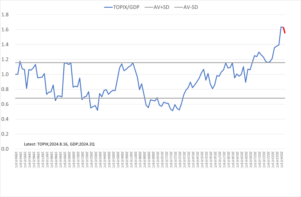 さらにGDP(名目、季節調整値)には同年第2四半期の数値を用い、8月16日のTOPIX終値(2,678.60)を使用したものも追加しておきました(グラフの赤線部分)。依然として株価は割高圏にありますが16日終値の予想PER(日経新聞;国内の株式指標・東証(16日))は15.47倍と適正圏内にあります。