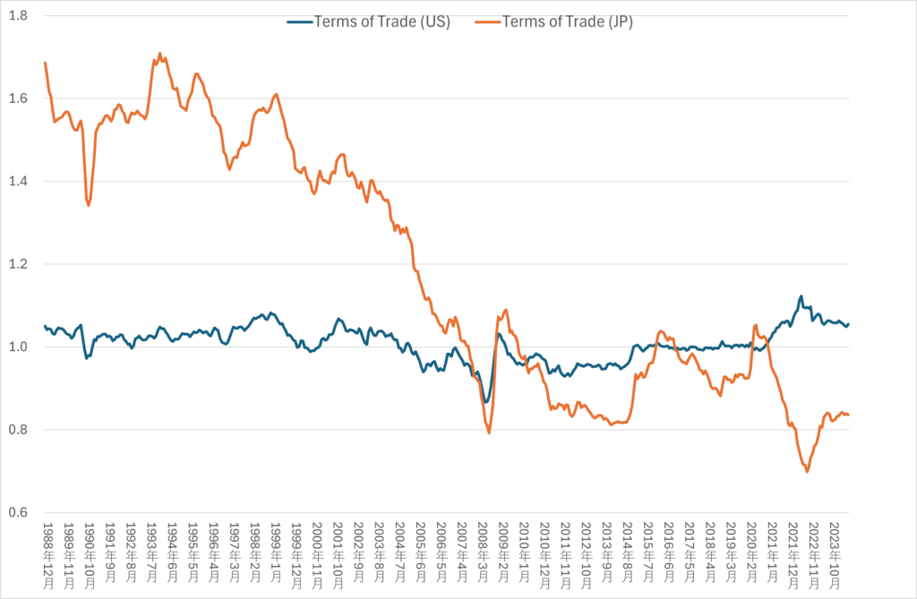 The graph above shows monthly data from December 1988 to July 2024. While the terms of trade in the United States have remained stable, Japan’s terms of trade have shown significant fluctuations and a gradual decline since the late 1990s.