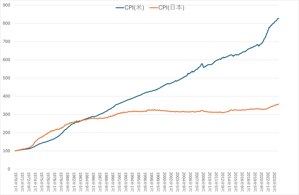 1970年を100として日米のCPIを確認してみると、日本のCPIは1995年頃から横ばい、アメリカのCPIは直線的に上昇しています。