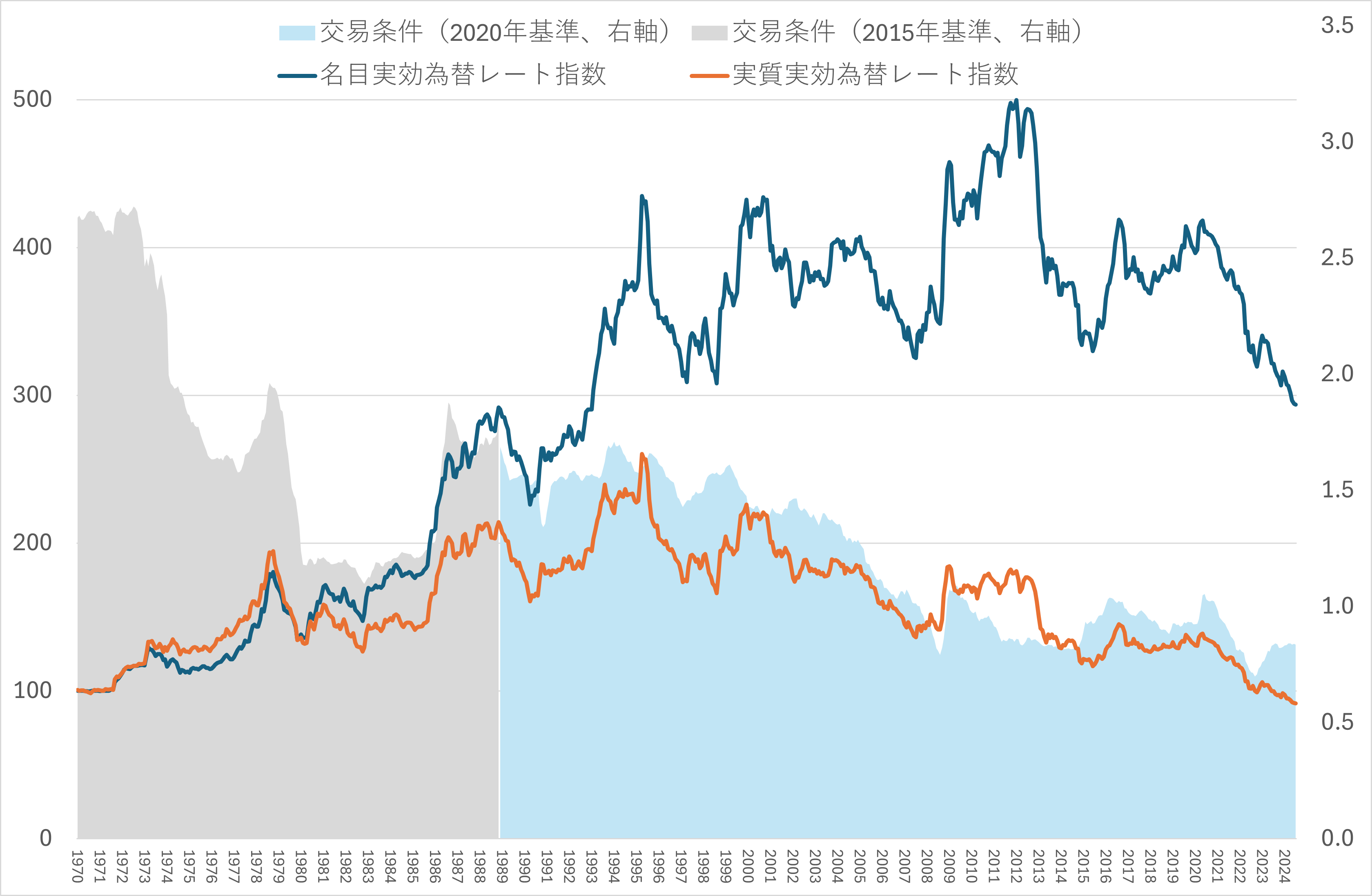 (注)交易条件は日銀が作成する輸出物価指数・輸入物価指数(2020年基準、2015年基準)から計算。名目実効為替レート指数、実質実効為替レート指数は1970年平均が100となるように基準化。