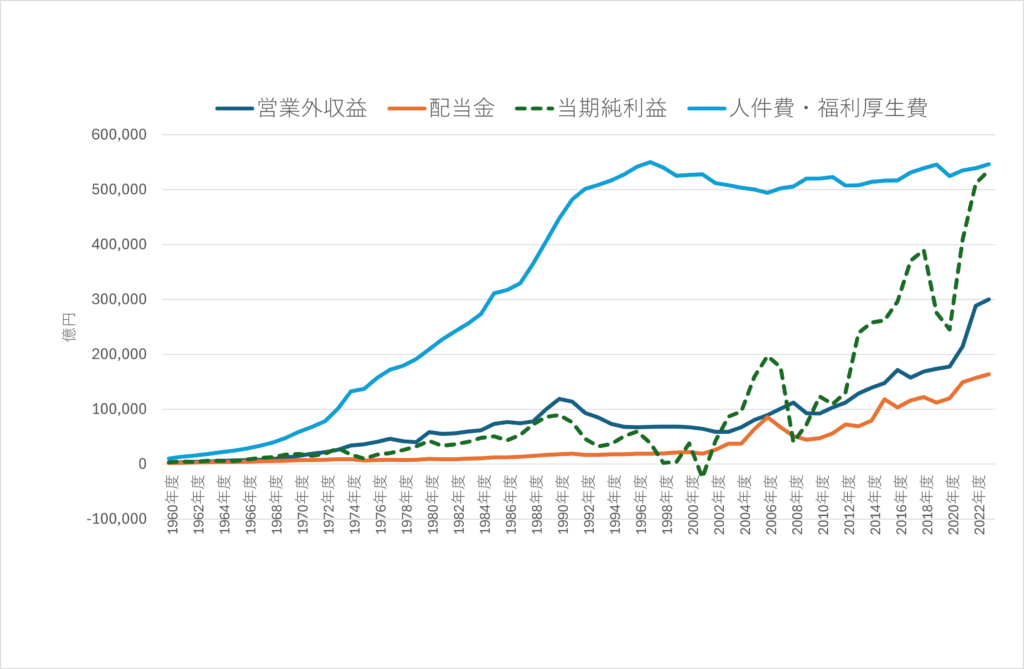 当期純利益は伸びているものの、一人当たりGDPと同様、人件費・福利厚生費も1990年代後半から横ばいになっています。海外子会社や他社からの受取配当は営業外収益、日本企業が支払った配当は配当金に計上されます。これらが2010年以降増えていることがわかります。