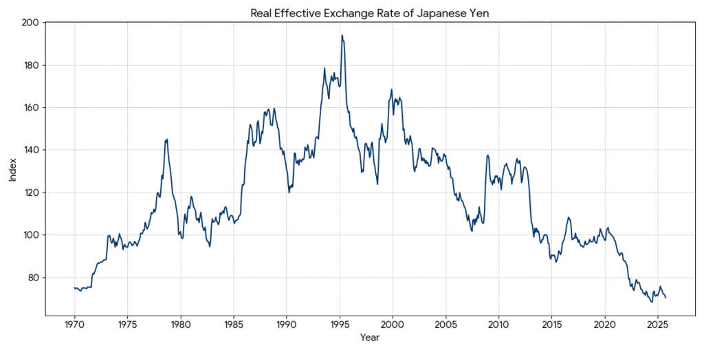 「今は1ドル150円だけど、またそのうち適正な水準(前回紹介した2024年のPPPは95円/ドル)に戻るだろう」 そう楽観視している人も多いかもしれません。しかし、物価の変動などを加味した「本当の円の実力(実質実効為替レート)」を見ると、もっと深刻な事実が浮かび上がります。