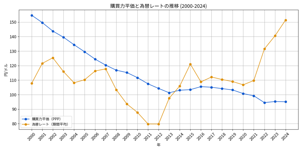 (注)2024年の円の購買力平価は1ドル95円、為替レートは151円